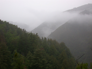 The trail contoured around the top of this cliff, which was relatively high--but the redwoods towered over it.