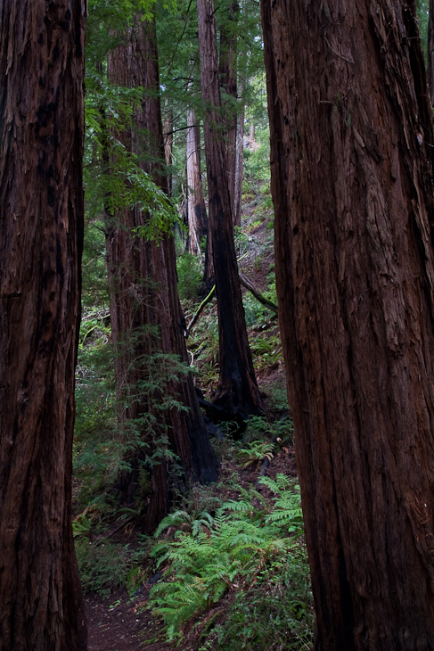 This fire on the Ben Johnson trail occurred many years ago, but the scars are still evident. Periodic fires benefit the redwoods at the expense of less fire tolerant trees. Fires used to be natural; now the park service has to set them from time to time