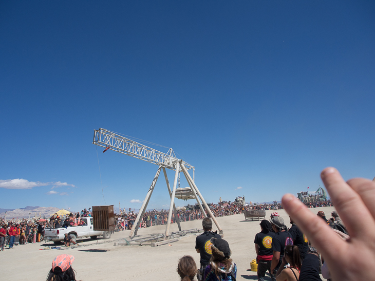 Piano, on fire, tossed by a trebuchet.