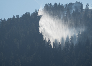 The terrain was too steep and difficult to send in a team of hotshots, so helicopters were used. Here a Chinook heavy helicopter makes a bucket drop on the ridge over Goat Creek.